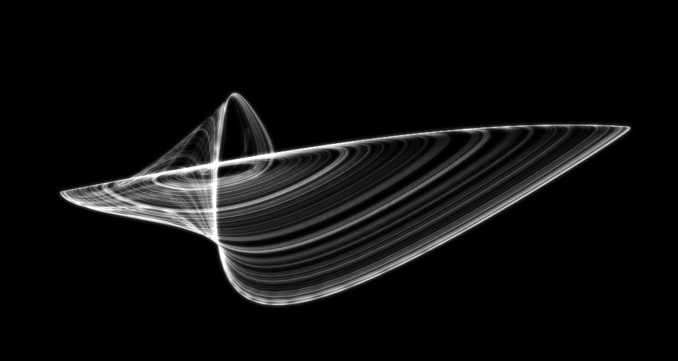 Podemos observar las siguientes características. Tras un transitorio inicial, la solución, que es el triplete $(x(t),y(t),z(t))$ de las tres densidades de población, se instala en un régimen oscilatorio irregular que parece persistir para todos los tiempos. Estas oscilaciones parecen no repetirse nunca exactamente: el movimiento es aperiódico. Geométricamente, vemos que, tras un transitorio, la trayectoria del sistema llena una especie de ‘superficie’. Esta superficie es bastante extraña porque atrae a todas las soluciones que parten de condiciones iniciales en su vecindad y que luego vagan por ella sin fin. Como veremos, las trayectorias correspondientes no pueden cruzarse, como consecuencia de un teorema general sobre ecuaciones diferenciales.