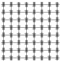 Décrivons-le très succinctement en dimension deux [4] : en chaque noeud d’une grille carrée de très grande taille (disons $10^23$ noeuds), on a une variable d’état qui est soit ’+’ et qui symbolise un « spin » orienté vers le haut, soit ’-’ et qui symbolise un spin orienté vers le bas.