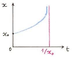 Thus the solution exists in the time interval $(-\infty,\frac{1}{x_0})$. Moreover, the system reaches infinity in finite time ! This phenomenon is called blow-up. It is of physical relevance in models of combustion and other runaway processes.