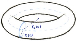 The first and third equations tell us that both $r_1$ and $r_2$ remain constant along any solution. Moreover, no matter what we choose for our initial $r_1$ and $r_2$ values, the $\theta_j$ equations remain the same. Given $r_1(0)$ (that is, the radius $r_1$ at time $t=0$), the first oscillator can be represented as a point rotating at constant speed along a circle of radius $r_1(0)$. The same holds for the second oscillator with a circle of radius $r_2(0)$ and with a different angular speed. For a given pairs $(r_1(0),r_2(0)$, the whole system can be visualized as a single point tracing out a trajectory on a torus (the surface of a doughnut) with $\theta_1,\theta_2$ coordinates. The coordinates are analogous to latitude and longitude.