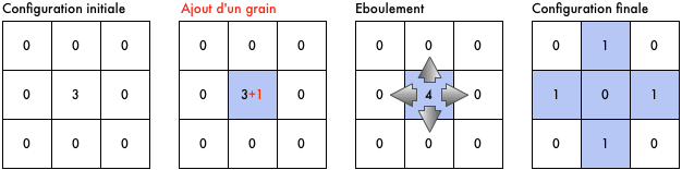 Imaginons un quadrillage de $3\times 3$ cases. Dans chaque case, nous pouvons empiler des « grains » avec une capacité maximale de trois grains. S’il y a quatre grains dans une case donnée, un éboulement se produit : la case se vide de ses quatre grains qui sont envoyés dans les quatre cases voisines, un par case.