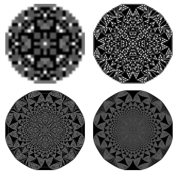 Si on divise à chaque fois le côté du quadrillage par la racine carrée du nombre de grains qu’on a ajoutés, cela revient à garder la taille du système constante et à prendre des cases de plus en plus petites qui vont devenir quasiment des points lorsque le nombre de grains ajoutés est très grand. La question est : obtient-on une forme limite par ce processus ? Voici par exemple ce qui se passe si on part de la configuration homogène avec $0$ grain par case et qu’on ajoute de plus en plus de grains :
