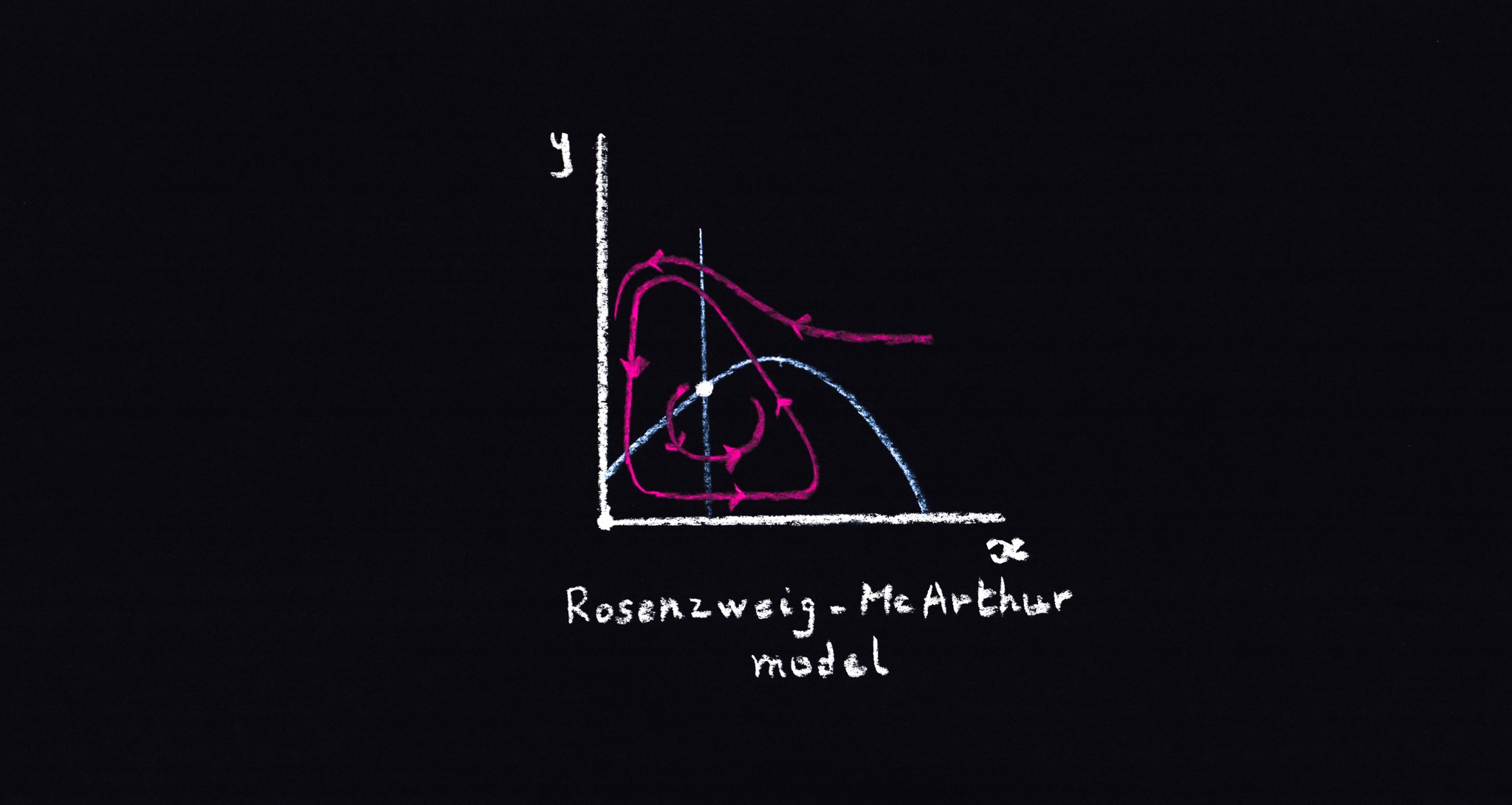 Una pregunta natural es: ¿qué factores biológicos crean ciclos límite en un modelo presa-predador? Uno de esos factores es la inclusión de lo que los ecólogos denominan "respuesta funcional". La respuesta funcional es la velocidad a la que cada depredador captura a su presa. En el modelo anterior, la respuesta funcional es una función linealmente creciente de la densidad de presas, lo que significa que los depredadores no se sacian. Una forma sencilla de remediarlo es tomar una respuesta funcional de la forma